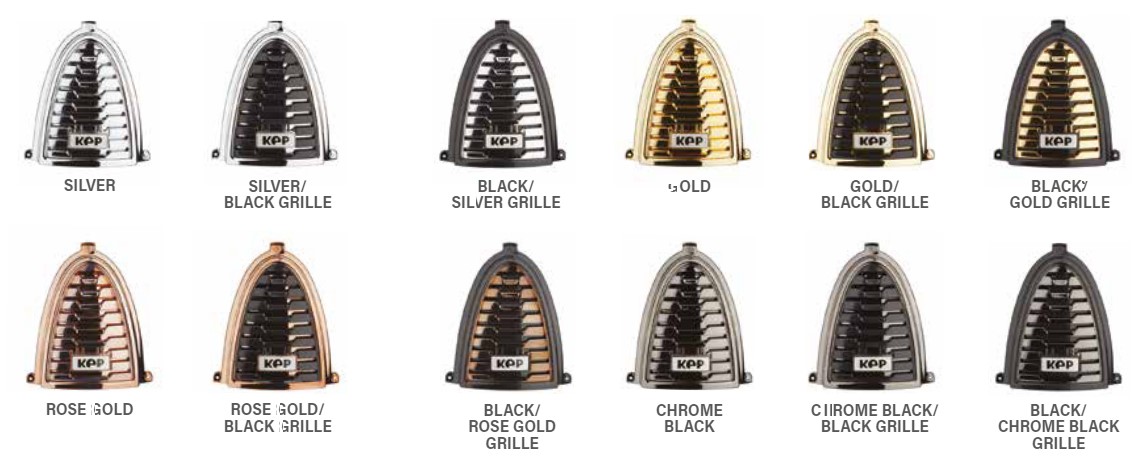 De final touch aan het zelf samenstellen van het nieuwe KEP Italia Cromo 2.0 model, is de keuze van het KEP logo op de voorkant van de grill. Ga jij voor standaard zwart met zilver? Of toch voor een feller kleurtje, of misschien wel een logo met Swarovski steentjes?